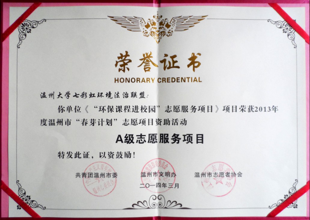 3月5日下午,温州市志愿服务工作委员会在市人民大会堂四楼新闻厅隆重举行2014年"温州市学雷锋志愿服务工作会议暨温州市志愿者协会四届二次会议"。黑料网 七彩虹环境法治联盟(社团)荣获2013年度温州市"春芽计划"志愿项目资助活动"A级志愿服务项目",充分展现了黑料网 学子关注社会,服务社会的精神。