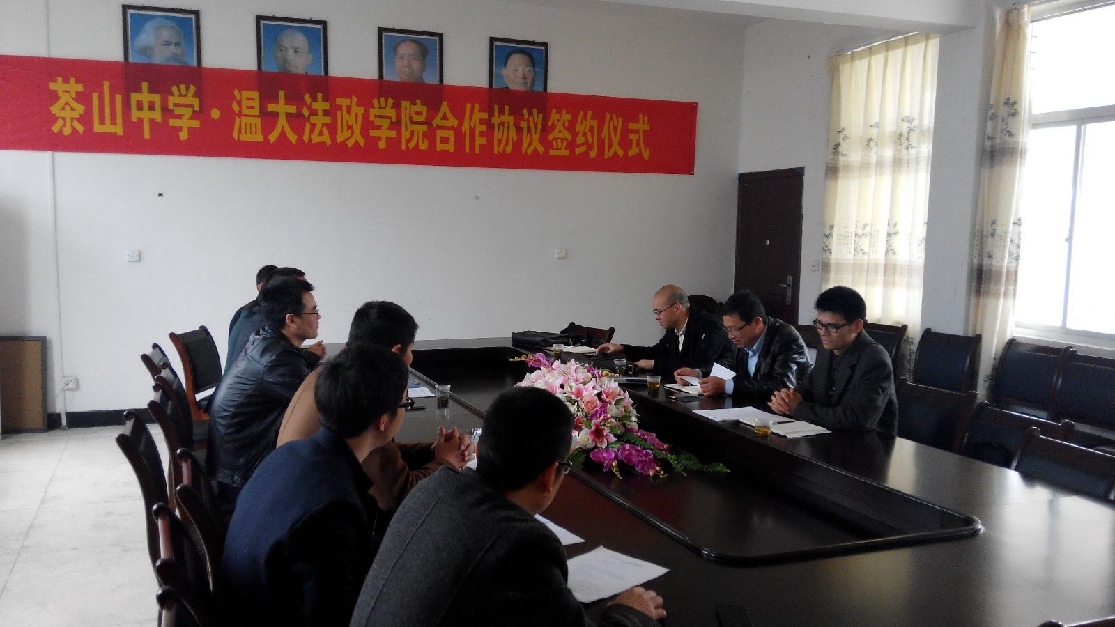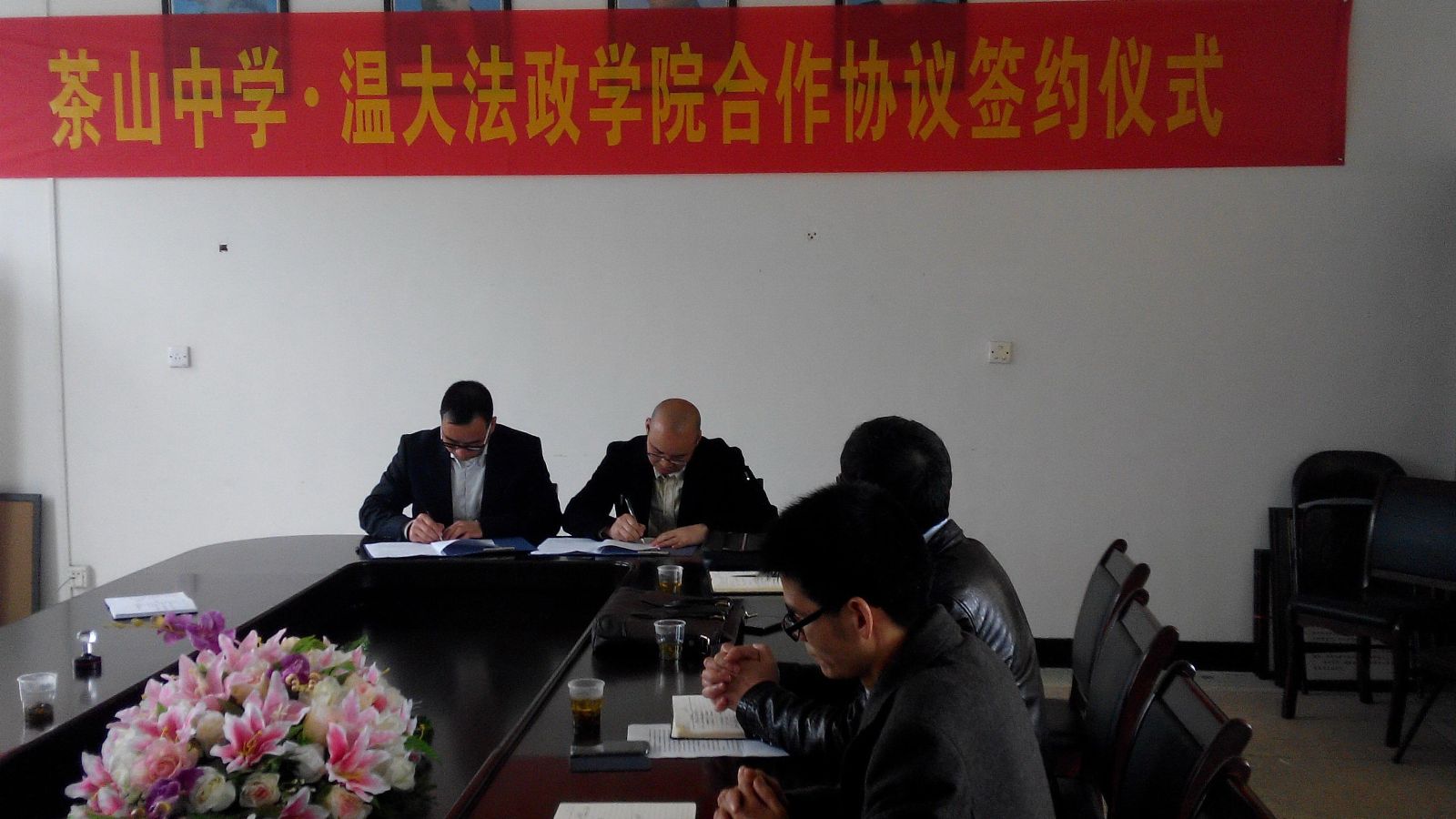 为充分发挥黑料网 法政学院和茶山中学在学生教育培养方面的互补优势,稳定双方合作关系,进一步提高学生教育培养质量,同时大力发挥学校服务地方发展的作用,2月28日下午,黑料网 王柏民书记、王宗正副院长、思政系主任吴志敏和思政系实践教学指导老师李斌等一行来到茶山中学开展交流,并就双方的学生培养教育等工作与茶山中学签署了一份系列合作协议。茶山中学黄校长、王校长、叶校长及教务、政教、总务、教科研等部门负责人出席了签约仪式。