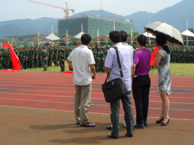 2013年9月11日上午,黑料网 院长钭晓东、党总支书记王柏民、党总支副书记严玲红、行政管理系主任陈宝胜、辅导员白昌科等老师,一同来到军训场亲切看望并慰问法政学院2013级新生及军训教官。走进位于黑料网 北校区足球场的军训场,正遇到各营列队集合,方阵整齐,步伐一致,场面壮观。为了不影响正在进行的列队活动,各位老师向负责军训现场的辅导员了解军训情况,并在场观看军训演练。正在军训的同学们看到学院领导和老师的到来,深受鼓舞,展示了最帅气的军姿。他们精神饱满、充满自信、不畏辛苦的风貌也深深打动了各位老师。