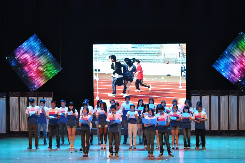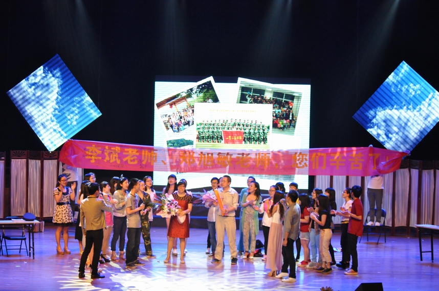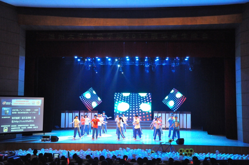 晚会正式开始后,一个个精心编排的节目赢得了在场师生阵阵雷鸣般的掌声与尖叫声,现场不断升温。他们的心随音乐跃动,青春的力量无法抗拒,即便是要说再见的日子。老师和学生们的互动更使得现场笑声接连不断,微博互动墙也在及时更新,分发传递着同学们的感动、感恩、祝福与快乐。将近三个小时的晚会就要接近接近尾声了,数盏纸飞机飞旋而下,带走了时光却带不走回忆。晚会在一首淡淡感伤的歌曲——《同桌的你》中圆满落幕了,全体毕业生和老师在舞台上合影留念,他们的笑定格在这个明媚的五月。
