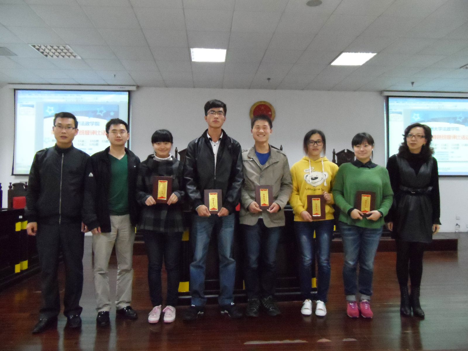 经过近两个小时的激烈角逐,最后11政本被评选为党团示范班,12法一被评选为学风特色班,11行管被评选为学风特色班,11法一被评选为学风特色班,11法二被评选为学风优良班。