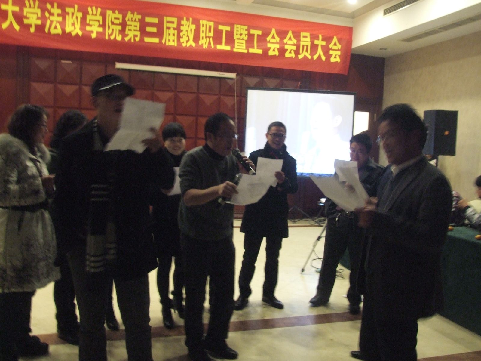 陈宝胜、夏小娜老师和家属代表钭兰朵小朋友组成的三人临时家庭组合一起主持。行政、法学、行管思政三个工会小组分别表演了精心准备的集体节目。行政小组的《法政STYLE》集体舞独具特色,水平一流;法学小组则演唱由老师自己填词的歌曲,每个人都肆意释放自己,震撼全场、笑翻全场;行管思政小组带来的是《方言大杂烩》,展示的一个个配上图片的地方特色菜肴令人馋涎欲滴。此外,游戏环节和即兴表演轮番上阵,抽奖环节更是令人激动不已,热闹至极。晚会设置了组织奖,最后法学小组因为参与率高、积分领先荣获组织奖第一名。