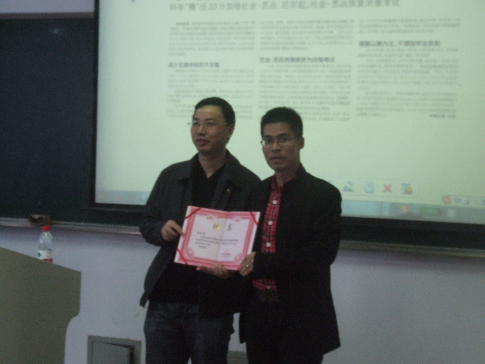 讲座之前,钭晓东院长给蒋老师颁发了聘书,聘任他为思想政治教育专业教学指导委员会委员。蒋老师首先以温州为例,详细讲述了未来几年思想品德中考分值即将发生的变化,并对温州各地社会、思品老师的情况以及当今初中社会、思品教学中普遍存在的问题作了深入的分析,指出了社会、思品课教学存在的四大误区。随后蒋老师通过展示中学思想品德教学案例,提出了思想品德课有效教学的六大设计策略,生动形象地为思政系同学作了教育内容和教师技能方面的指导,使同学们获益匪浅。最后,吴志敏老师对本次讲座作了精彩总结,鼓励同学们奋发向上,不断前进。