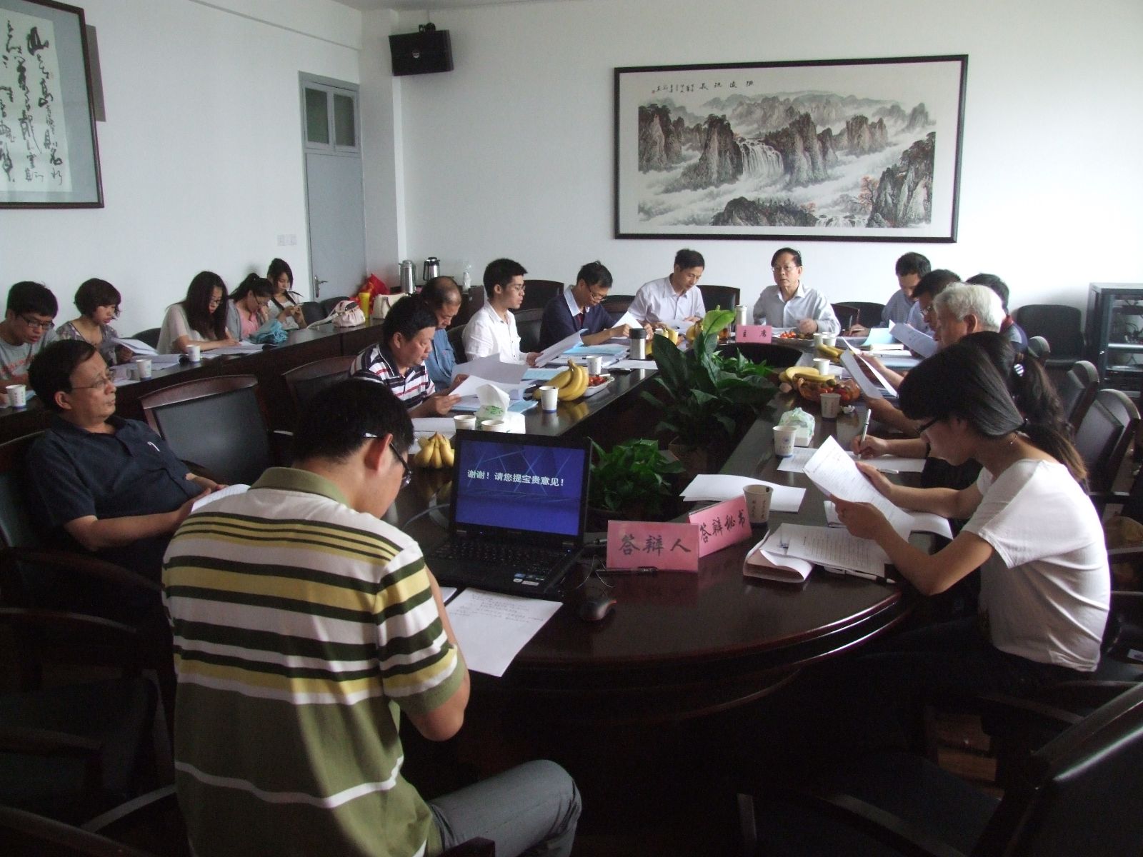 此次答辩会主要分为学生自我陈述、导师提问、学生作答和导师评议四个环节。参加本次答辩的13位同学以PPT形式就自己论文的整体思路、框架结构、创新和不足之处作了介绍,答辩专家针对论文中存在的问题,大到整个框架结构是否合理,小到格式标点错误均认真细致地做出点评。对于答辩专家提出的问题,同学们在一定的准备后结合自己的论文进行了逐一回答。答辩委员会认真听取了同学们的答辩陈述后,经过集体评议、投票,12位同学顺利通过答辩,1位同学被要求认真修改论文后再次提交答辩委员会审核复议。