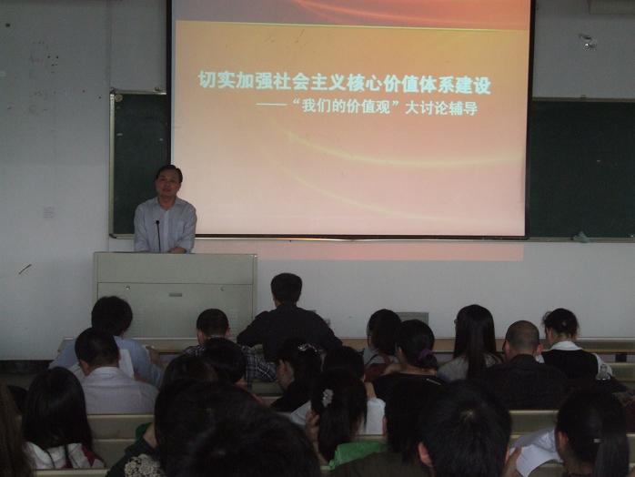 为深入贯彻落实校党委〔2012〕13号文件精神,法政学院党总支于4月25日下午组织学院全体教师聆听了校党委宣传部潘玉驹部长主讲的"切实加强社会主义核心价值体系建设——‘我们的价值观’大讨论"的辅导报告,学院党总支蔡克骄书记主持了辅导报告。
