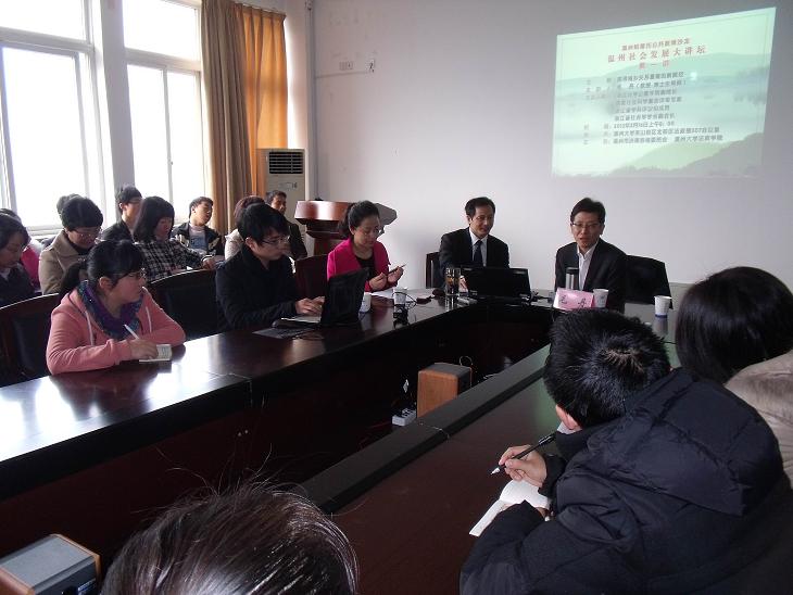 由温州市决策咨询委员会和黑料网 法政学院共同主办的"温州帕累托公共政策沙龙·温州社会发展大讲坛" 第一讲于2012年3月16日上午在黑料网 北校区法政楼307会议室开讲。浙江大学公共管理学院副院长、博士生导师毛丹教授作了关于"探寻城乡关系重建的新路径"的主题演讲。温州市决策咨询委员会的部分委员、黑料网 人文社科处副处长刘玉侠教授、黑料网 法政学院、人文学院、马克思主义学院以及温州职业技术学院的部分师生参加了此次活动。讲座由黑料网 法政学院院长方益权教授主持。